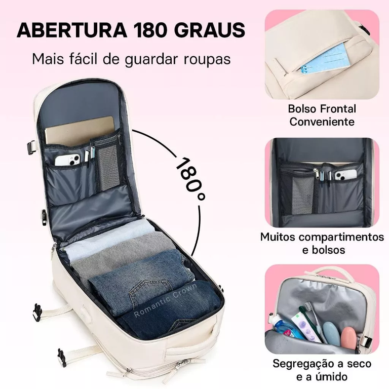 Tamanho: Excelente. Acaba se convertendo em uma mala de bordo. Muito espaçosa, espaços bem distribuídos para facilitar a organização. Possui alça de mão para carregar tanto na horizontal, quanto na vertical, além da alça para acoplar na mala. Amei 😘😘😘😘